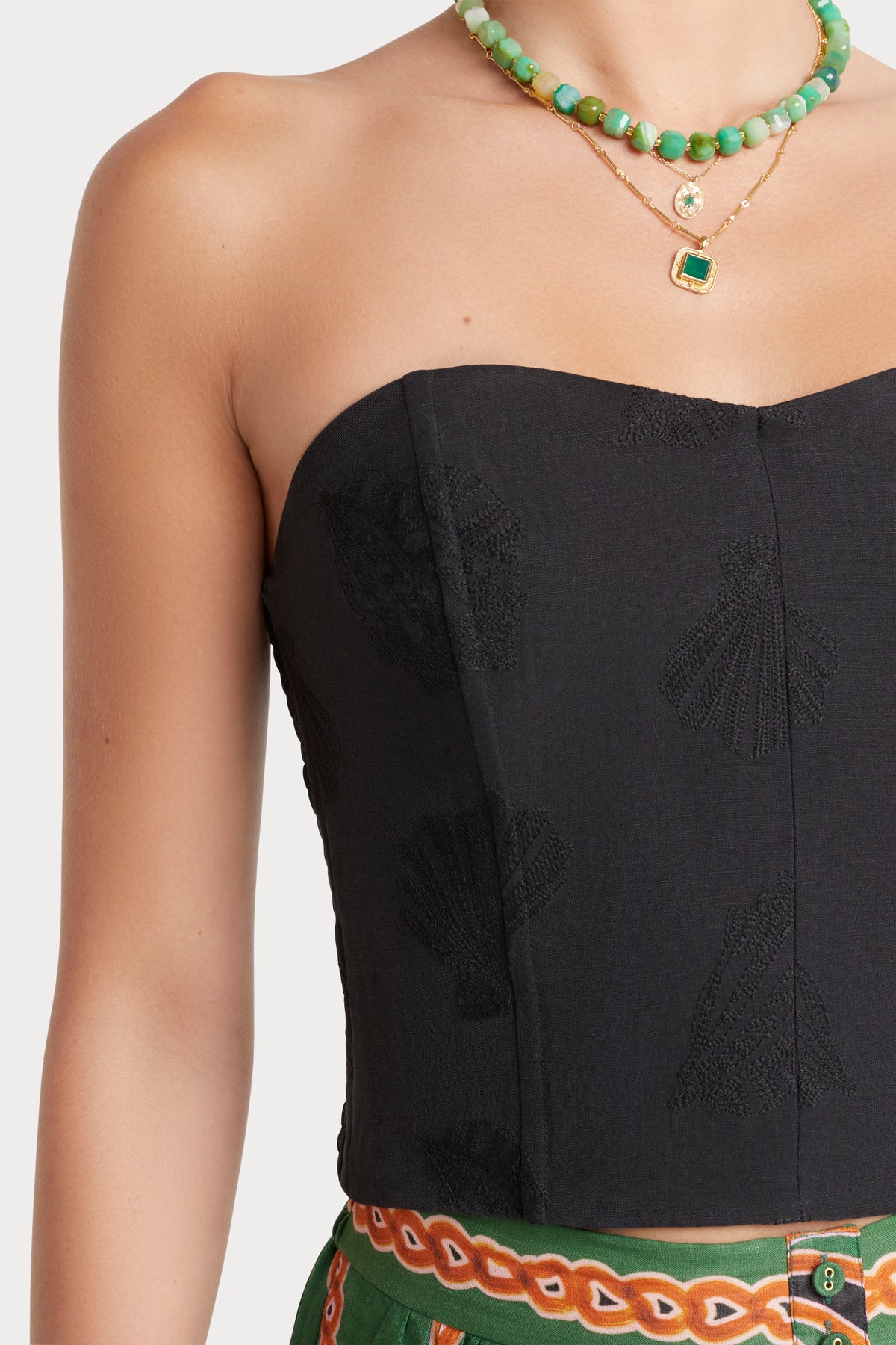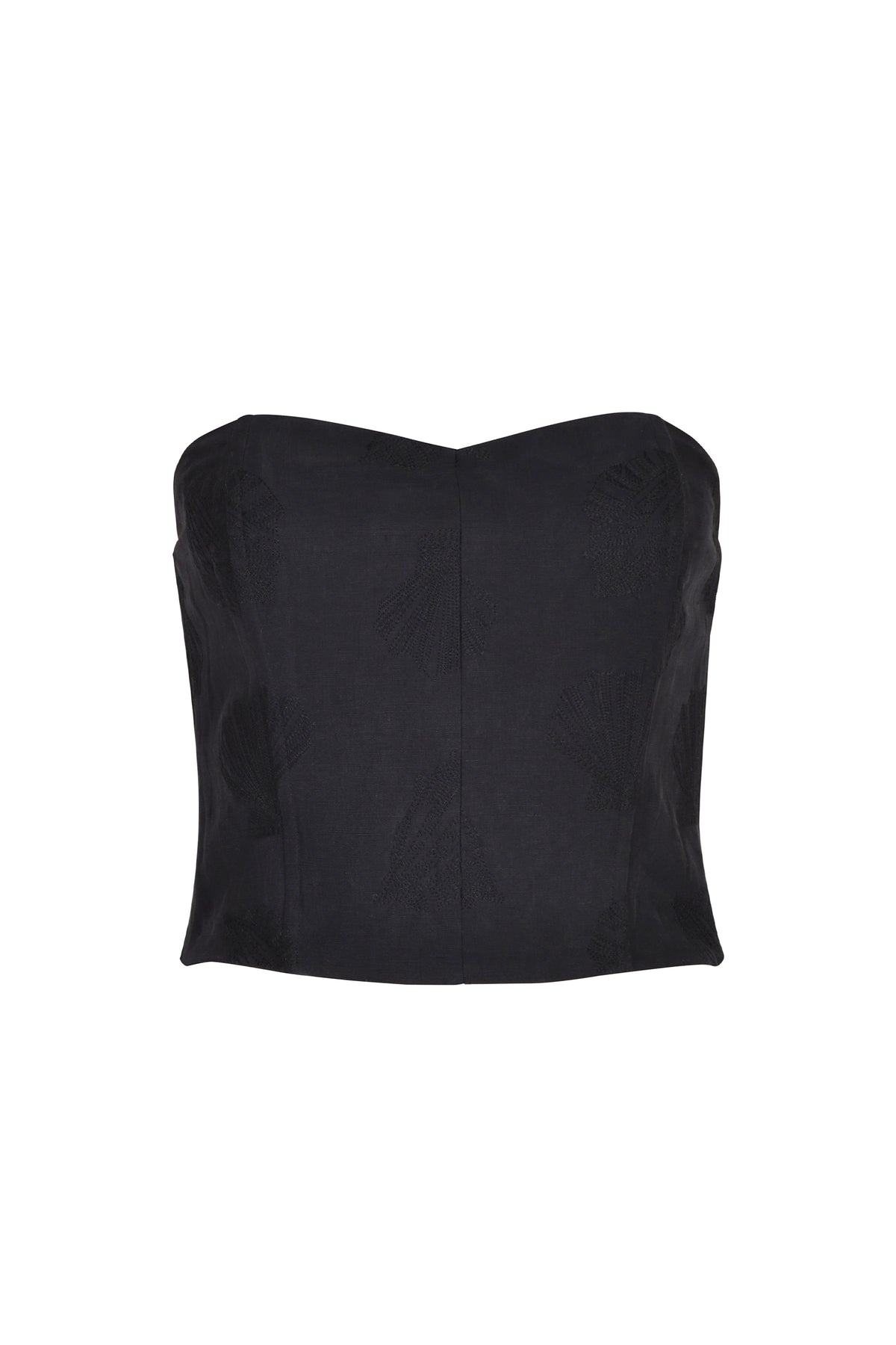 The Selene Bustier exudes refined femininity, crafted from a luxurious silk-cotton blend with shell embroidery detail. Perfect for layering or wearing on its own for polished elegance.