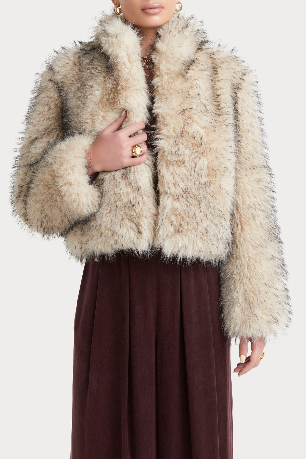A statement faux fur jacket in a soft fox-inspired finish, designed to elevate evening and occasion dressing. Crafted with a plush texture and shawl neckline, offering warmth with a refined, feminine edge. The cropped silhouette makes it the perfect layering piece over dresses and tailored separates.
