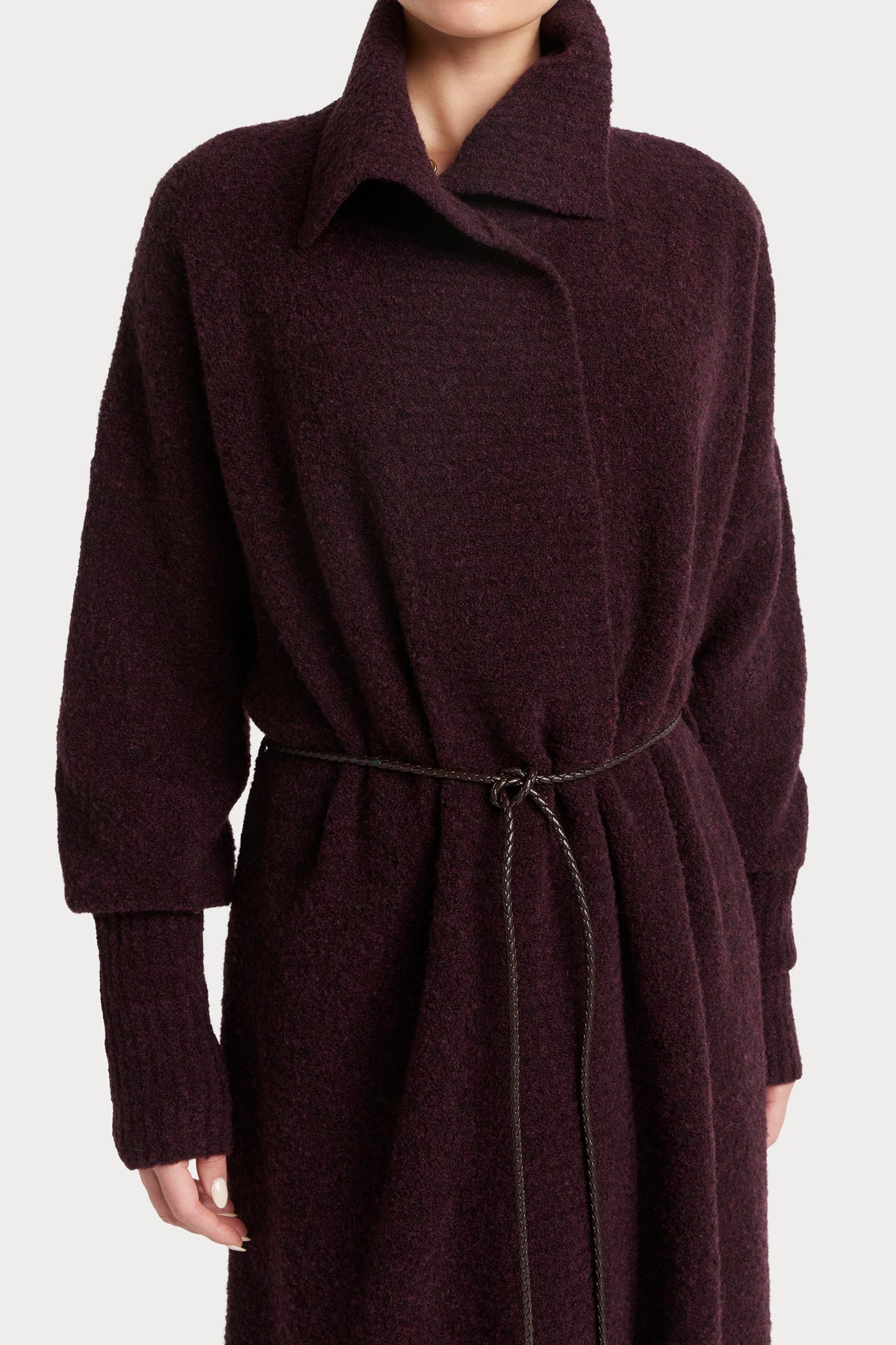 An elevated winter essential, this wool bouclé longline cardigan is designed to skim the silhouette. The softly structured collar and wrap-style front create an elegant, feminine shape. Effortlessly polished, it brings warmth and style to cold-weather dressing.