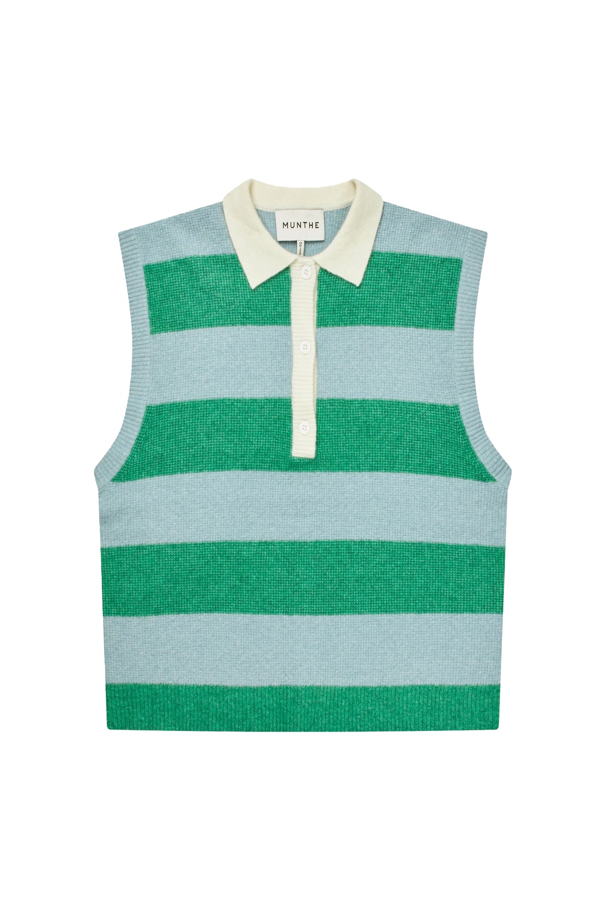 Effortless layering piece with timeless appeal. This sleeveless knitted vest features bold horizontal stripes anchored by a refined contrast collar and subtle button detailing. The versatile cut transitions seamlessly from standalone styling to a polished layering base, making it an essential addition to any curated wardrobe. Perfect for elevating both casual and refined looks.