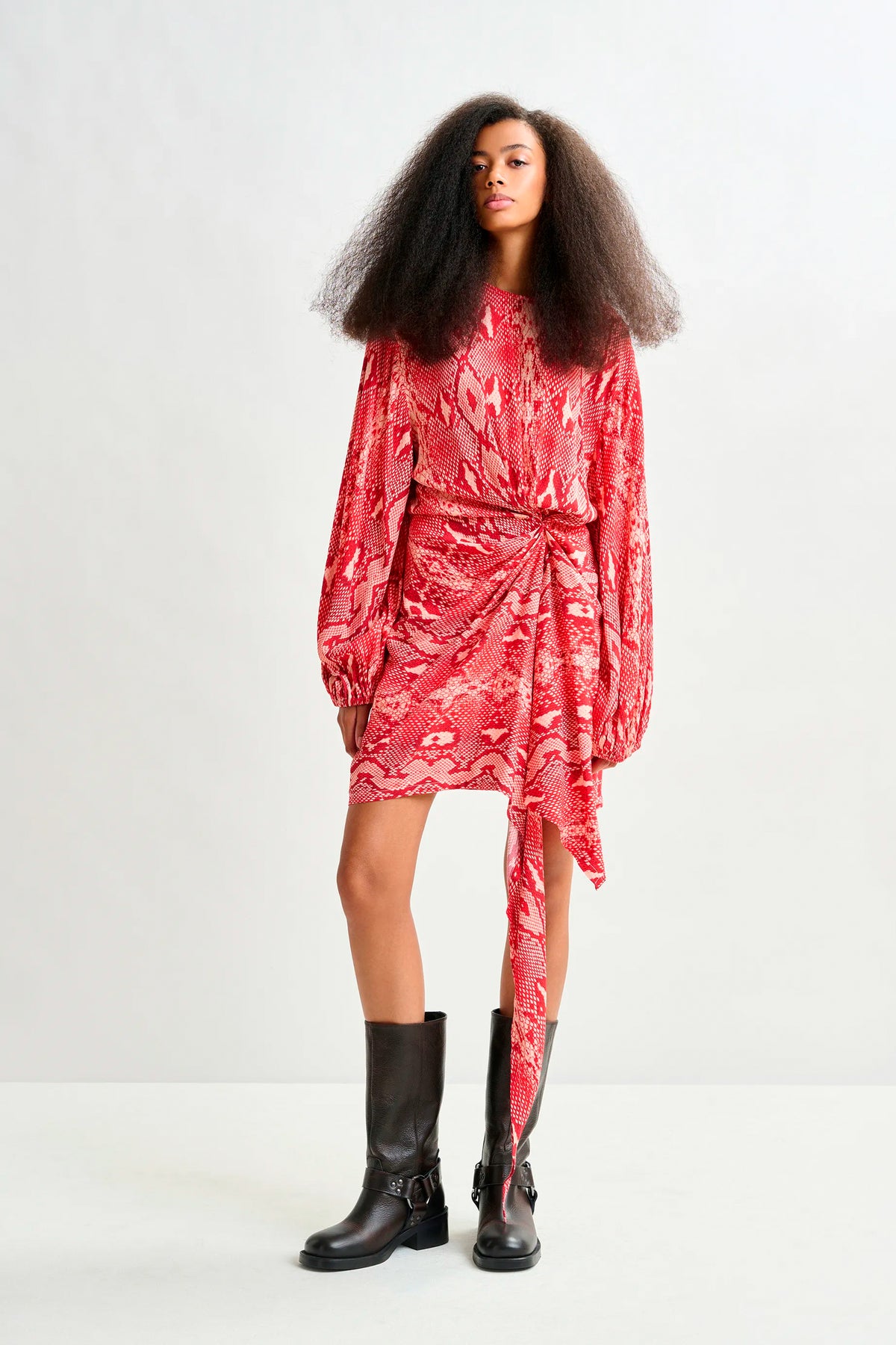 Mini dress features dropped shoulders and balloon sleeves finished with elasticated cuffs. Fabric is gathered at the waist to create definition, while the asymmetrically draped skirt panel adds movement and dimension. A discreet slit offers ease of wear, and hidden zip fastenings at the back and waist ensure a clean finish. Partially lined for coverage.